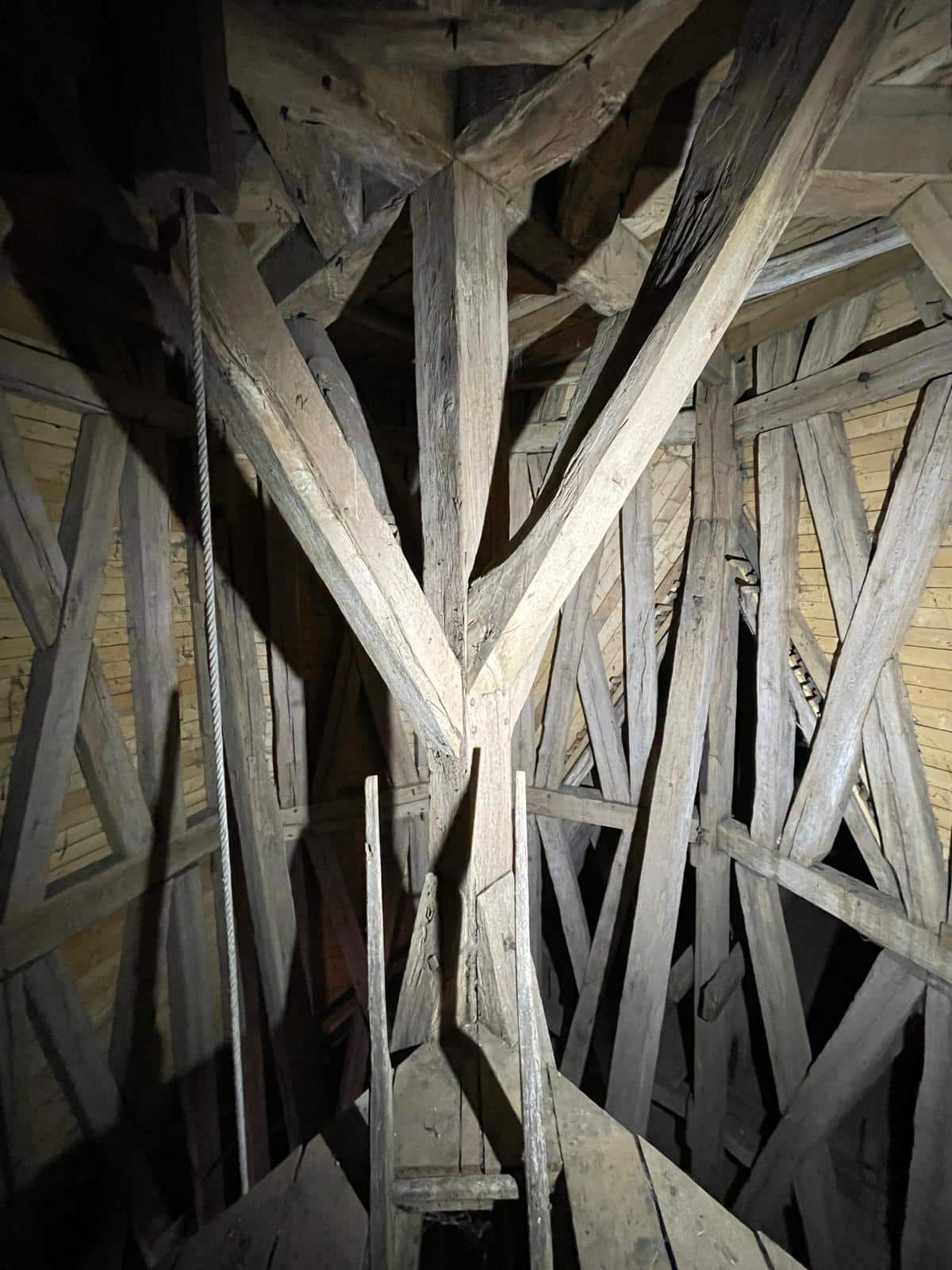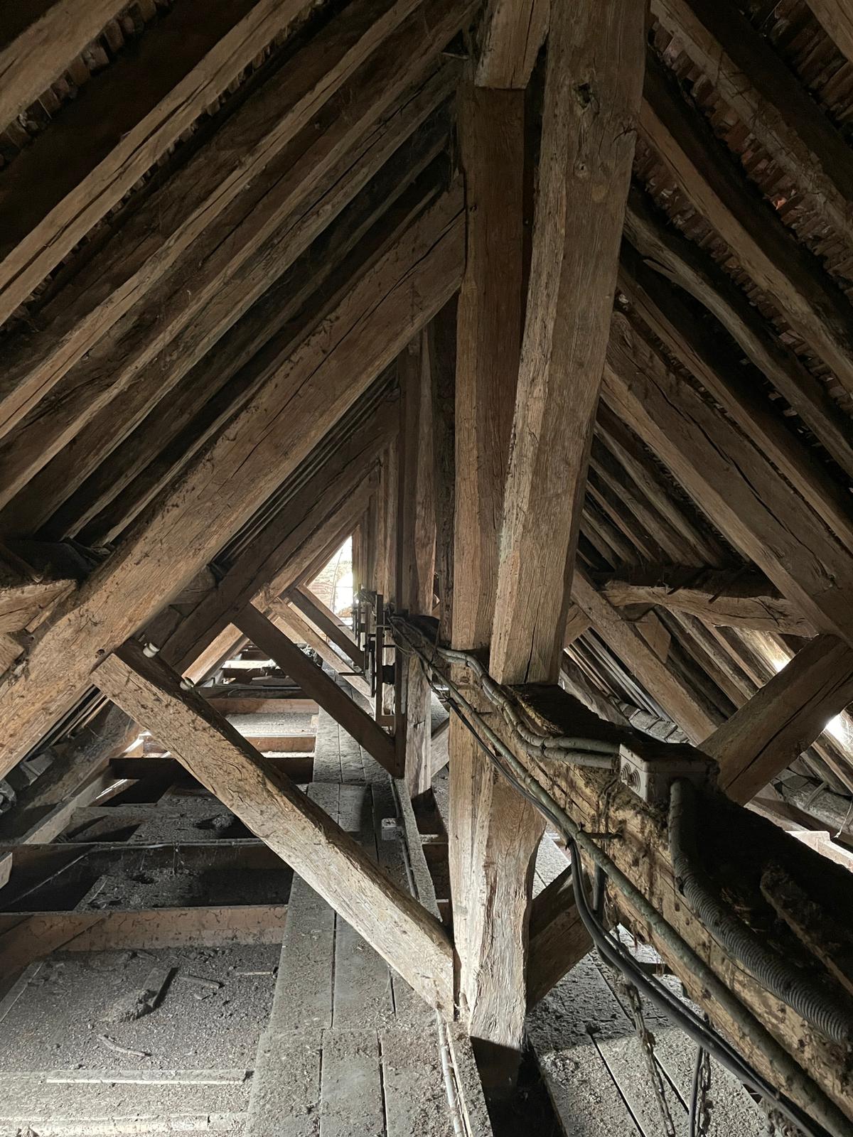🔎 Une inspection a également permis d’admirer l’impressionnante charpente du clocher de l’église Notre-Dame de Malicorne.