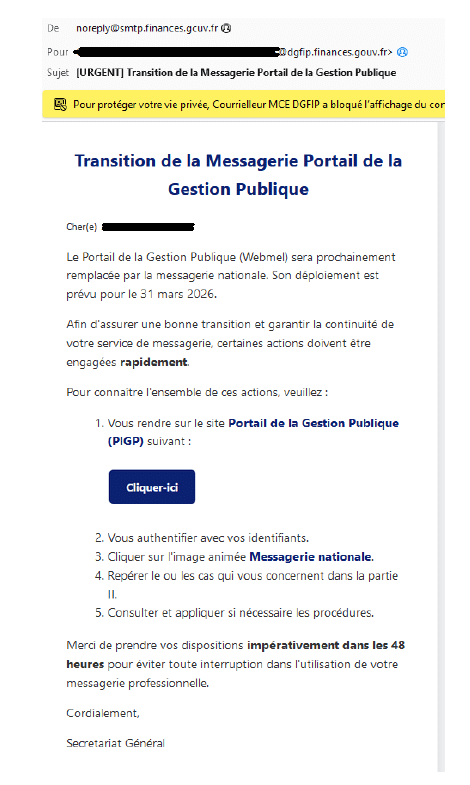 📢 INFORMATION IMPORTANTE : COURRIEL FRAUDULEUX Transition de la Messagerie Portail de la Gestion Publique