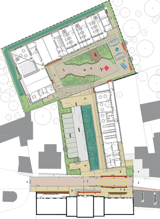 L’ensemble des bâtiments s’organisera autour d’un cœur végétalisé : la cour de récréation, pensée comme une véritable oasis de jeu, de détente, et d’ombre et de fraîcheur aux beaux jours.