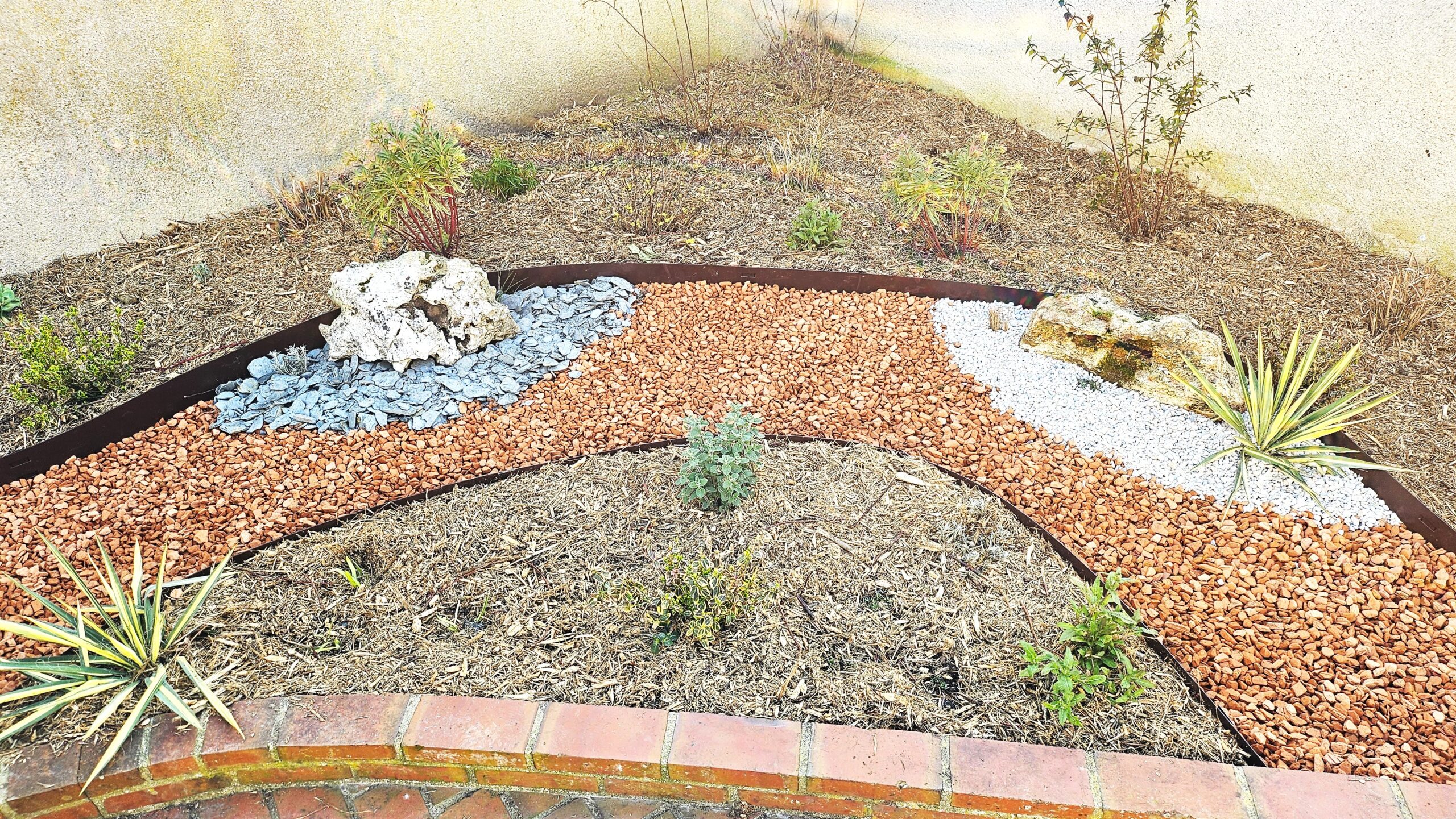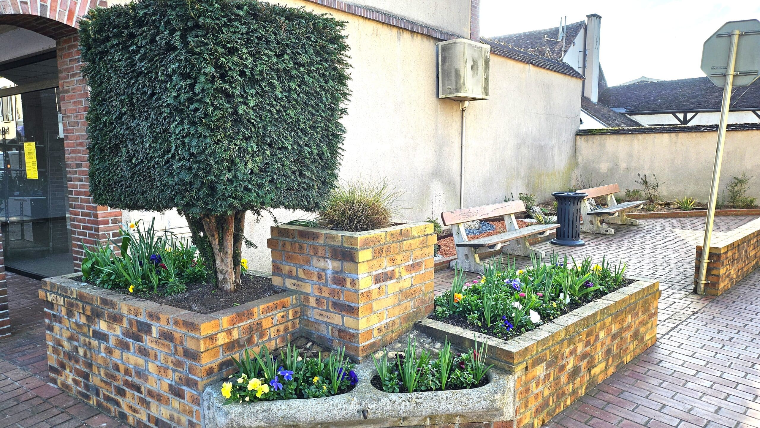 Les agents de la commune ont d’abord retiré le chèvrefeuille vieillissant afin de redonner souffle et lumière à cet espace. Ils ont ensuite structuré le lieu avec des bordures métalliques élégantes, créant un cheminement minéral en paillage de brique, à la fois esthétique et harmonieux.