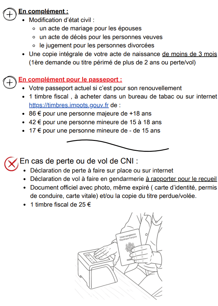 - Pour les majeurs : les mêmes pièces que pour la première demande, votre carte d’identité actuelle ou un document avec photo justifiant de votre identité (ex : permis de conduire), la déclaration de perte qui peut être faite lors du dépôt de votre de dossier, ou la déclaration de vol réalisée en gendarmerie ou en commissariat, 25 € en timbres fiscaux.