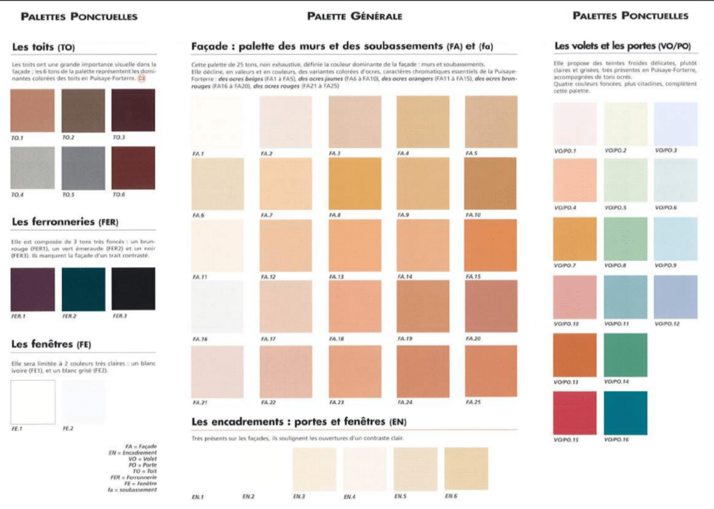 Palette de couleurs extraite du GUIDE DES RECOMMANDATIONS ARCHITECTURALES ET PAYSAGÈRES DE LA PUISAYE FORTERRE