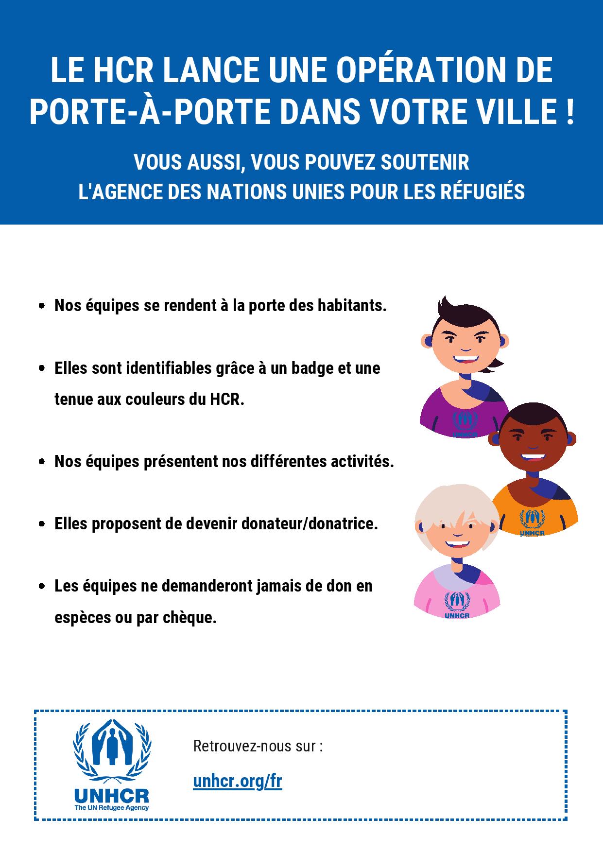 Mandatée par le HCR France, l' équipe ira à la rencontre des habitants du lundi au samedi, en journée jusqu’à 20h, clairement identifiée par un badge et des vêtements aux couleurs du HCR France